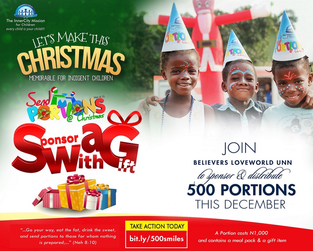 Join us to light up the faces of 500 indigent children with the perfect Christmas smile, as we send 500 meal portions this December. No better way to say "Jesus loves you" to a hungry child! Join us to make this a reality