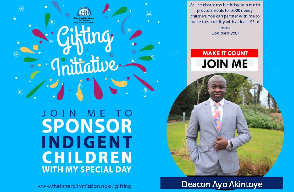 As i celebrate my birthday, join me to provide meals for 3000 needy children. You can partner with me to make this a reality with at least $3 or more. God bless you!