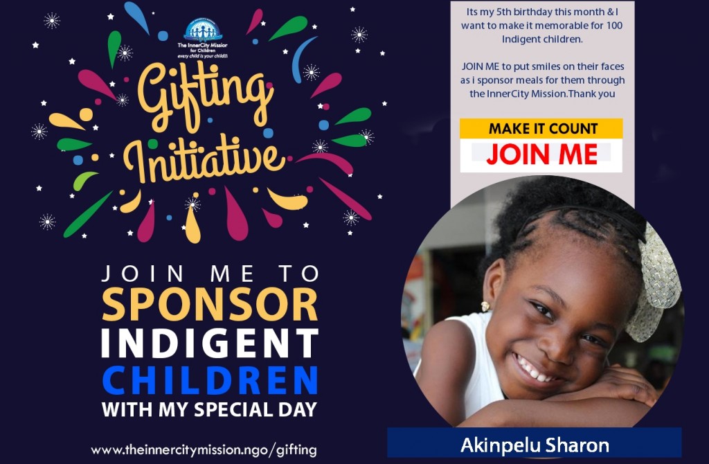 Its my 5th birthday this month & I want to make it memorable for 100 Indigent children. Please JOIN ME to put smiles on their faces as i sponsor meals for them through the InnerCity Mission. Thanks and God bless you