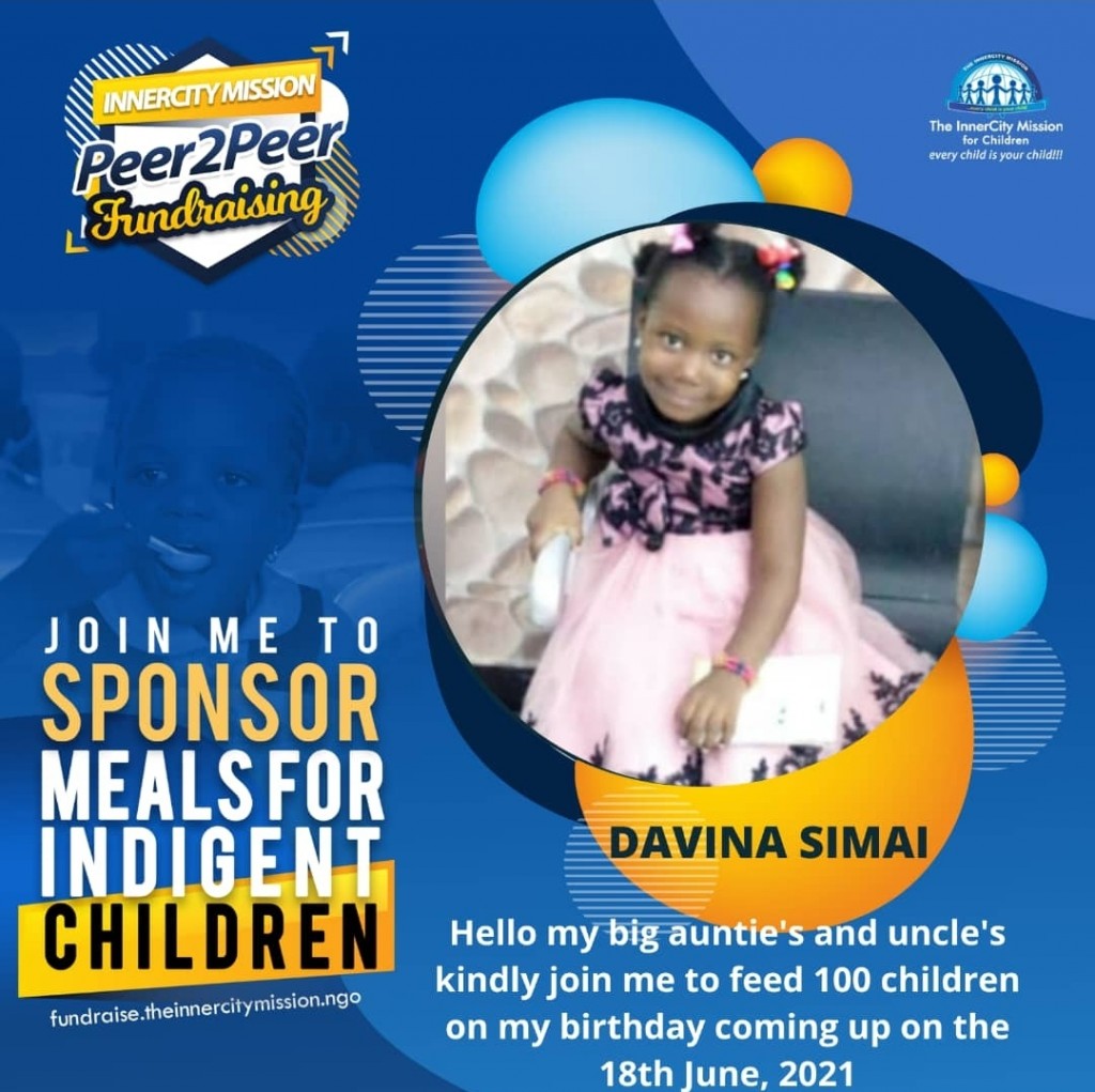 Hello my big auntie's and uncle's! kindly join me to feed 100 children on my birthday coming up on the 18th June, 2021. Your sponsorship will help save a child from the threat of hunger. ... Remember Every Child is your Child