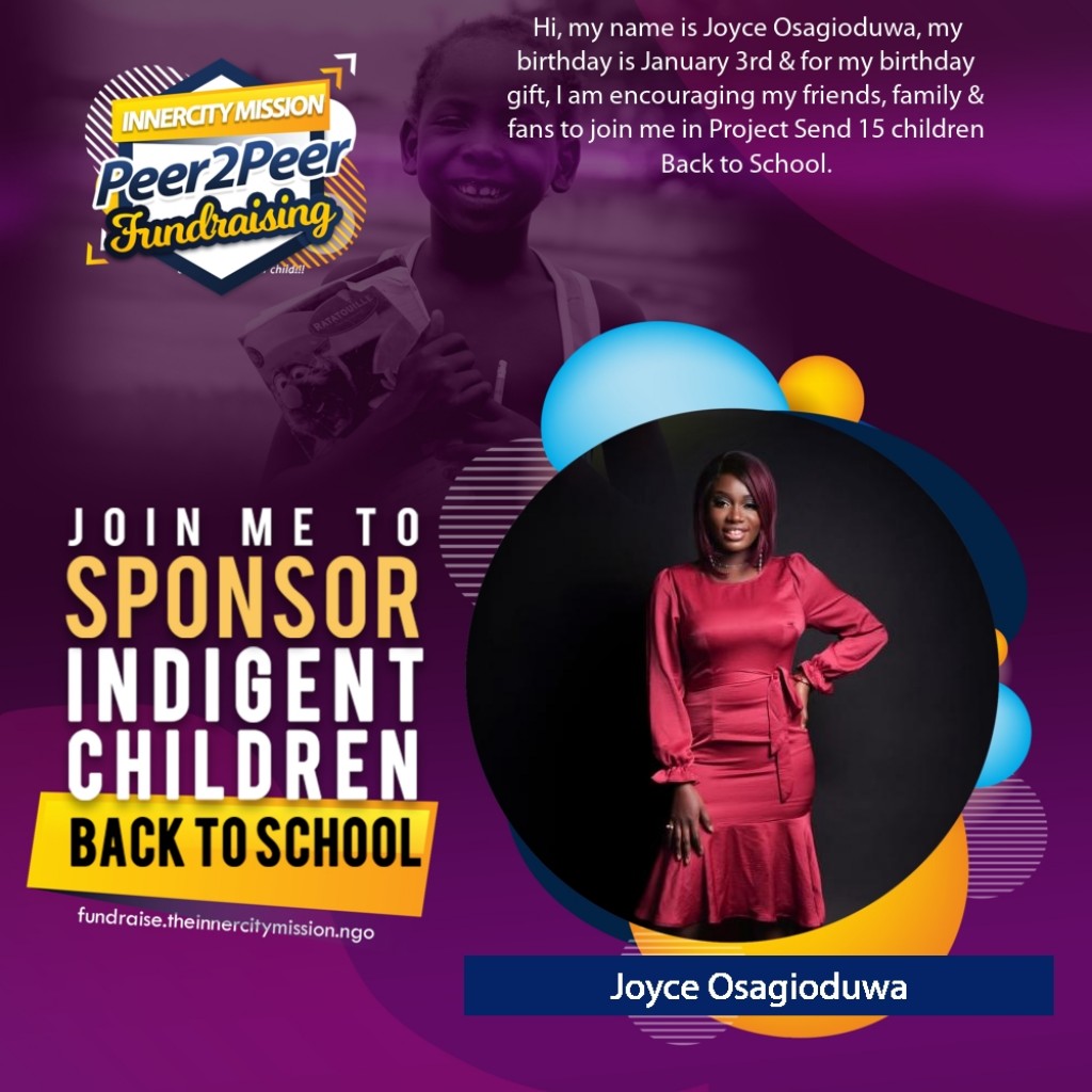Hi, my name is Joyce Osagioduwa, my birthday is January 3rd and for my birthday gift, I am challenging my friends, family and fans to join in the project of sending 15 children back to School. *To sponsor a child is 10 thousand* Let's catch them youn