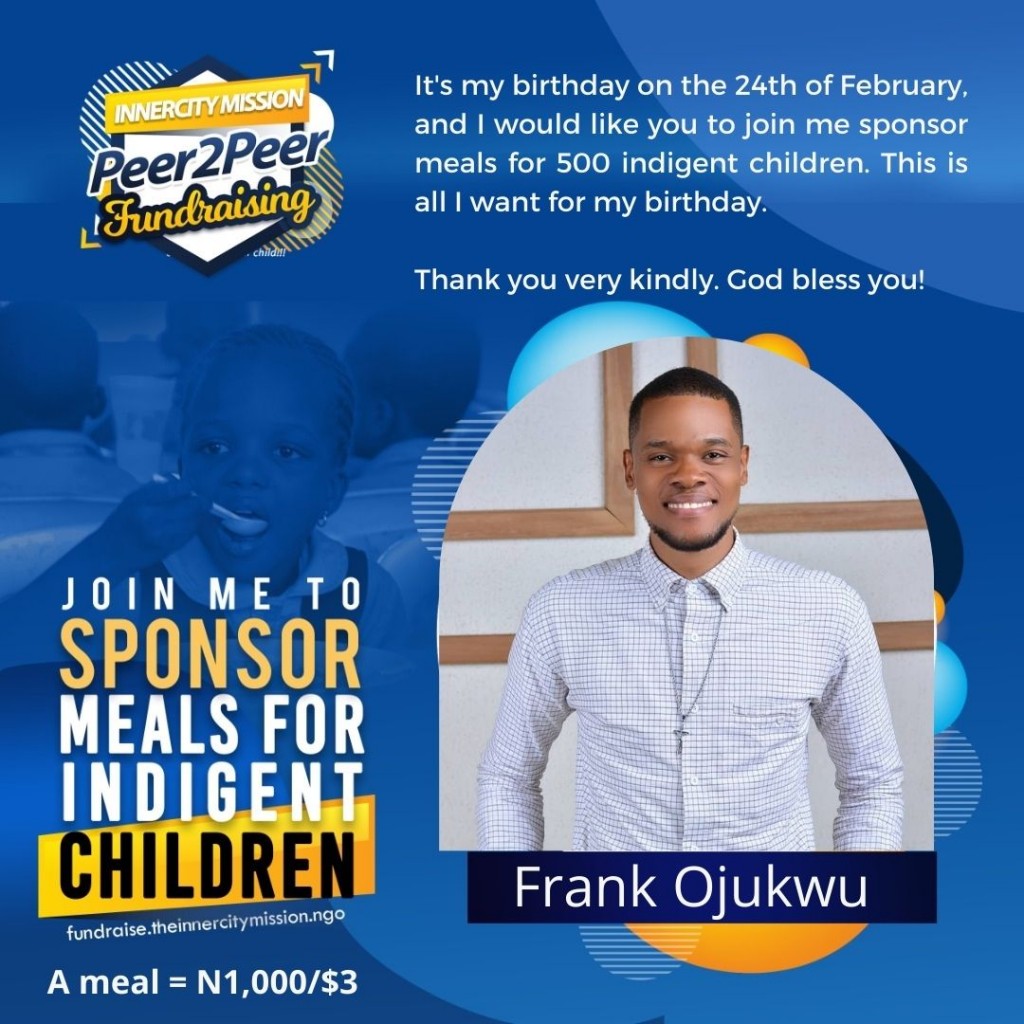 It's my birthday on the 24th of February, and I would like you to join me sponsor meals for 500 indigent children. A meal costs only #1000($2). This is all I want for my birthday. Thank you very kindly. God bless you
