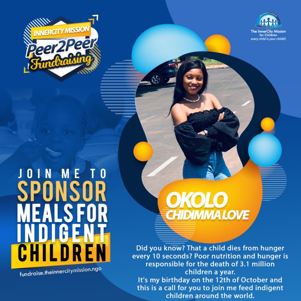 Did you know? That a child dies from hunger every 10 seconds? Poor nutrition and hunger is responsible for the death of 3.1 million children a year. It's my birthday on the 12th of October and this is a call for you to join me feed indigent children