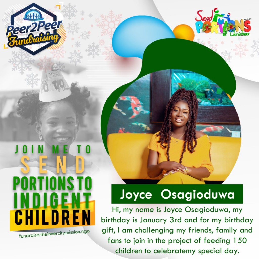 Hi, my name is Joyce Osagioduwa, my birthday is January 3rd and for my birthday gift, I am challenging my friends, family and fans to join in the project of feeding 150 children to celebratemy special day.
