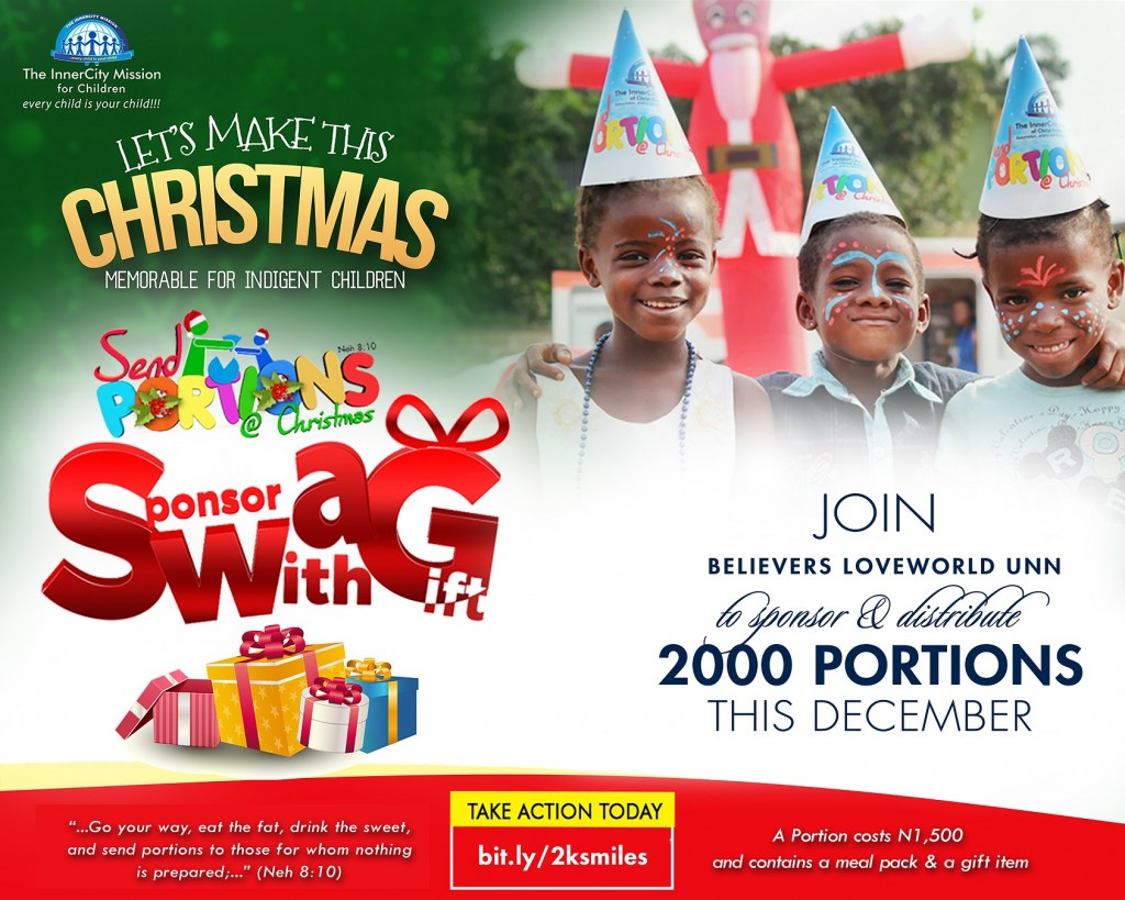 Join us to light up the faces of 2000 indigent children with the perfect Christmas smile, as we send 2000 meal portions this December. No better way to say "Jesus loves you" to a hungry child! Join us to make this a reality