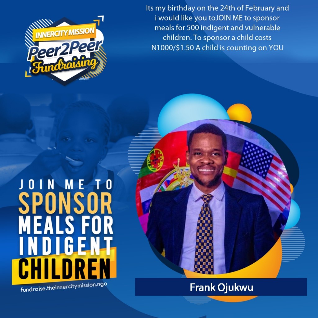 It's my birthday on the 24th of February and i would like you to join me to sponsor meals for 500 indigent and vulnerable children. To sponsor a day's meal for a child costs N1000/$1.50 A child is counting on your support.