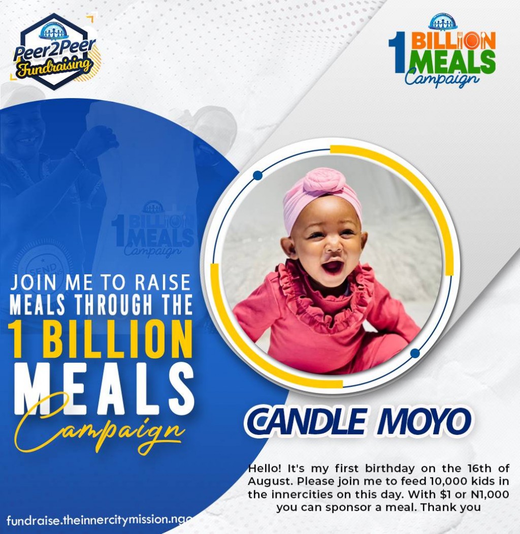 Hello! It's my first birthday on the 16th of August. Please join me to feed 10,000 kids in the innercities on this day. With $1 or N1,000 you can sponsor a meal. Thank you