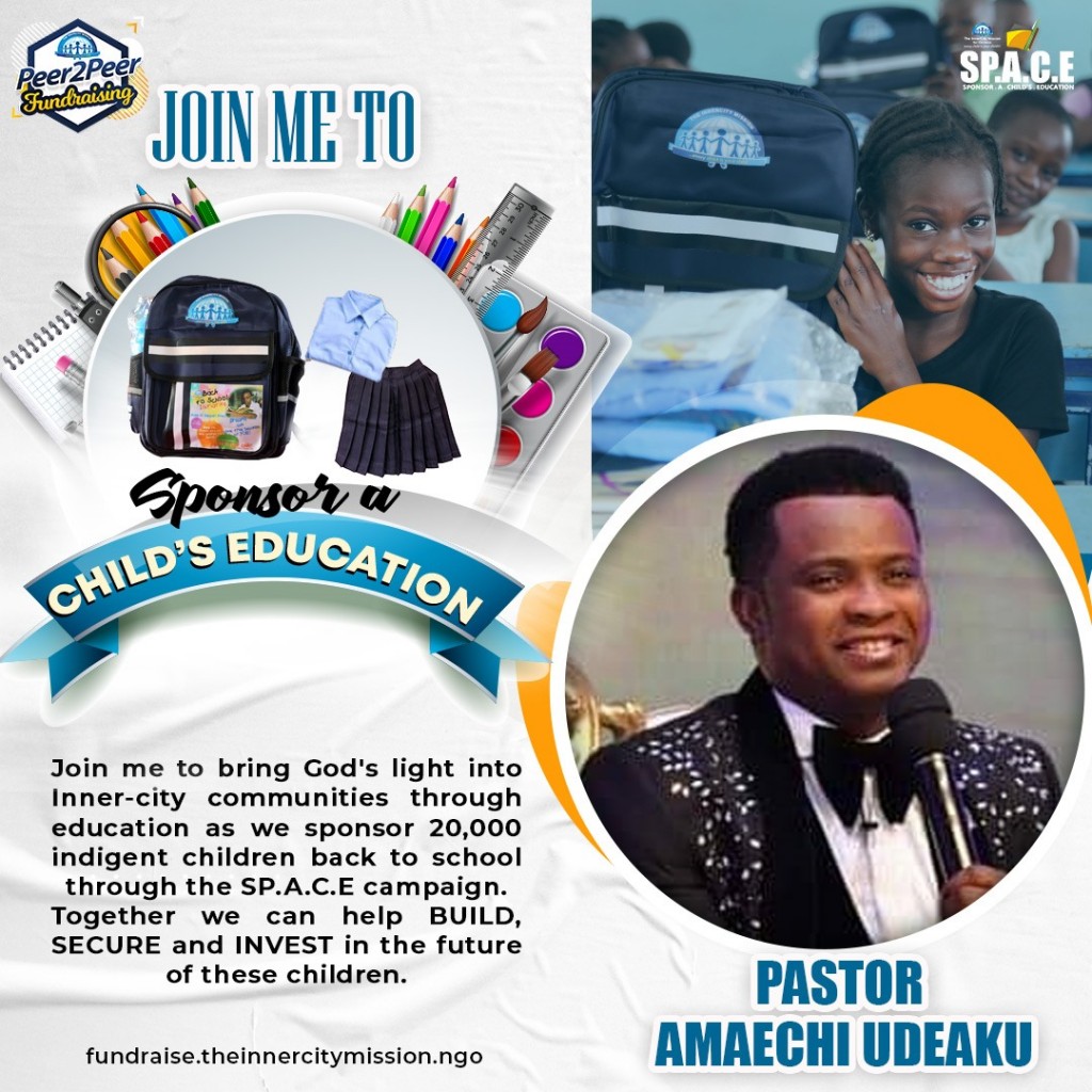 Join me to bring God's light into Inner-city communities through education as we sponsor 20,000 indigent children back to school through the SP.A.C.E campaign. Together we can help BUILD, SECURE and INVEST in the future of these children.