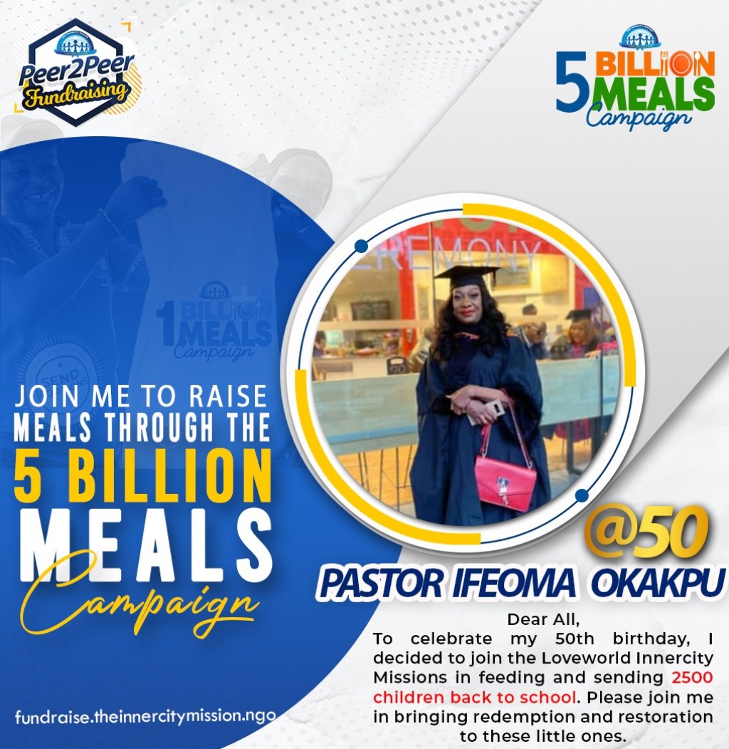 Dear All, To celebrate my 50th birthday, I decided to join the Loveworld Innercity Missions in feeding and sending 2500 children back to school. Please join me in bringing redemption and restoration to these little ones.
