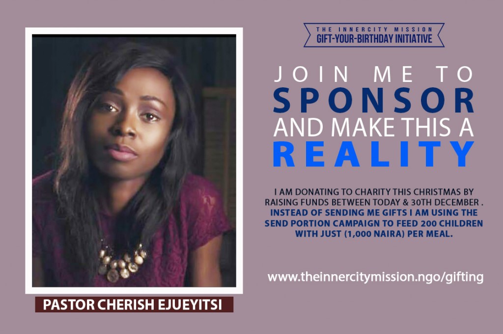 I am Donating to Charity this Christmas by Raising Funds between Today & 30th December . Instead of sending me gifts I am using the Send Portion Campaign to feed 200 Children with just (1,000 naira) per meal. PLEASE JOIN ME TO MAKE THIS A REALITY.