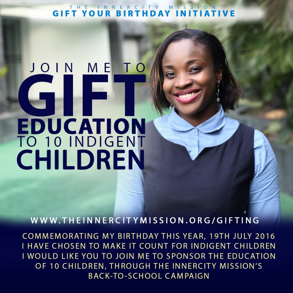 And it's my birthday on the 19th of July 2016.This year, I have chosen to make it count for children who are not in school or had to drop out because of the financial burden of getting an education. Through the InnerCity Mission's Back to School Campaign, I would like you to join me to help sponsor 10 children back to school in the coming session.