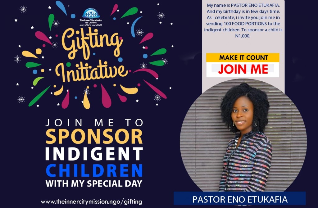 My name is PASTOR ENO ETUKAFIA. And my birthday is in few days time. As i celebrate, i invite you join me in sending 100 FOOD PORTIONS to the indigent children. To sponsor a child is N1,000. Join me to give them a reason to smile.